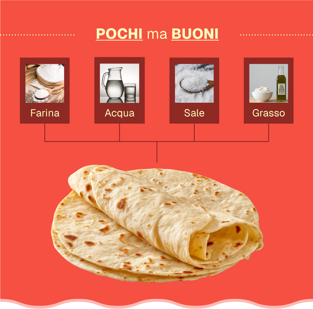 La piadina nasce da un impasto fatto di farina di grano tenero, acqua, sale e una parte grassa, tradizionalmente strutto oppure olio. Quando la farina si mescola con l’acqua, alcune proteine (glutenine e gliadine) si uniscono formando il glutine, ovvero una rete elastica che tiene insieme l’impasto. Nella piadina, però, l’impasto è poco idratato e poco lavorato: per questo la rete di glutine è limitata e il risultato è un prodotto più friabile rispetto al pane.