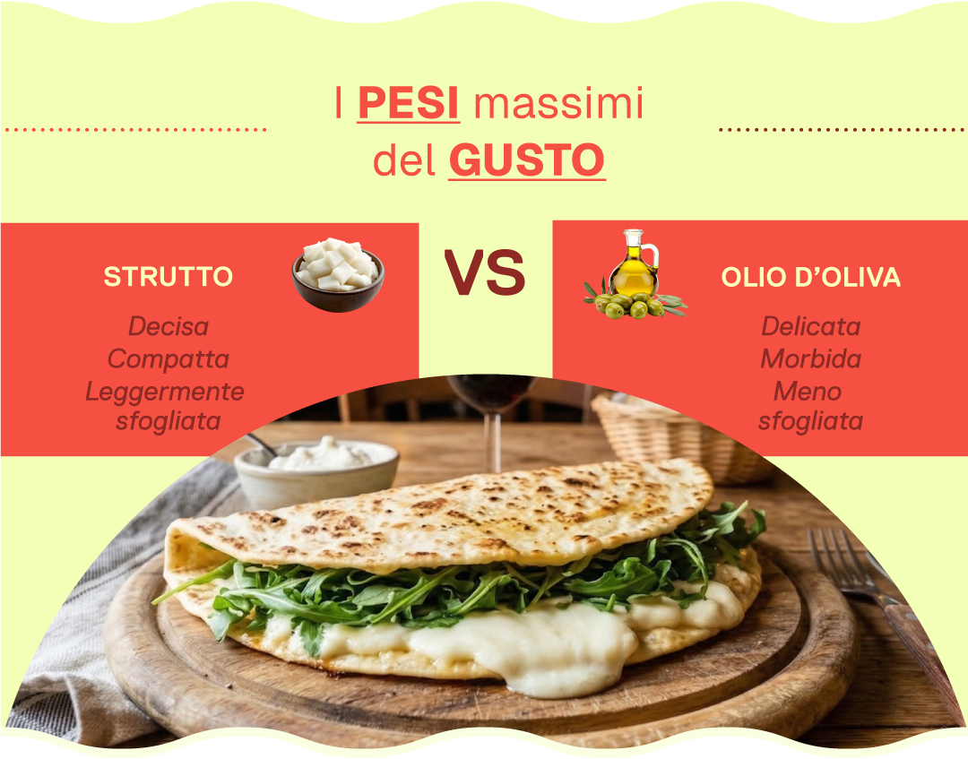 A seconda del grasso scelto la piadina che si ottiene ha caratteristiche diverse. Con lo strutto, che è un grasso semi-solido, la piadina tende a essere più compatta e leggermente sfogliata, perché i cristalli di grasso si distribuiscono tra le catene del glutine, ostacolando la formazione di un reticolo più elastico. Con l’olio, che è un grasso liquido, l’impasto si amalgama in modo più uniforme e la piadina risulta più morbida ed elastica, meno sfogliata, perché non si creano le micro-barriere solido/liquide tipiche dello strutto. Cambia anche il gusto: più ricco e deciso con lo strutto, più delicato con l’olio.