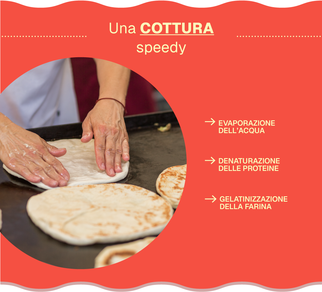 Tradizionalmente, la piadina viene cotta su una piastra di terracotta, chiamata “testo”, oppure su una piastra di metallo molto calda. Durante la cottura avvengono diverse trasformazioni chimiche e fisiche: l’acqua dell’impasto evapora rapidamente, mentre l’amido della farina assorbe acqua e si gelatinizza, cioè i suoi granuli si gonfiano e formano una struttura più stabile. Allo stesso tempo le proteine del glutine si denaturano, modificando la loro struttura e contribuendo al raggiungimento della consistenza tipica. Poiché la cottura è molto rapida non si forma una vera mollica come nel pane, e il risultato è quindi la tipica piadina sottile, compatta e leggermente dorata.