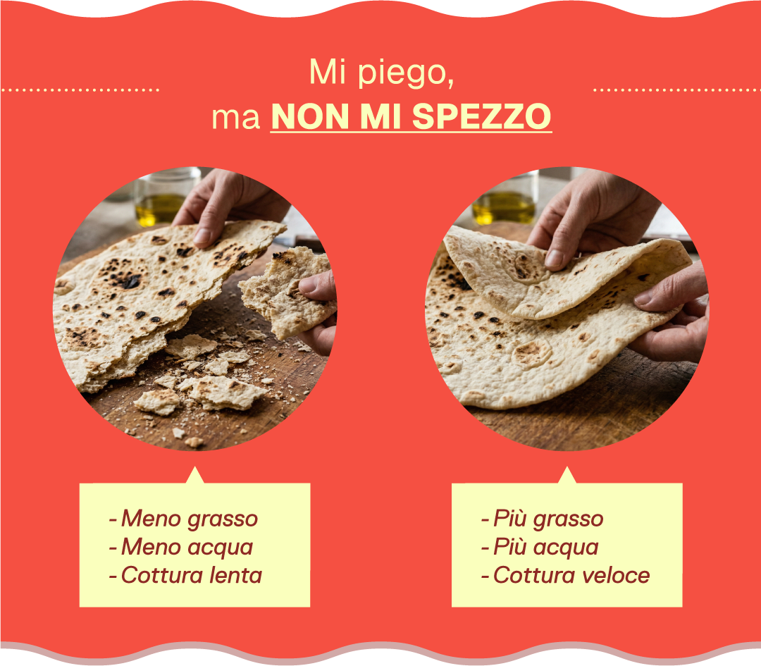 Le piadine possono essere morbide ed elastiche, altre più sottili e croccanti. La differenza di consistenza dipende soprattutto da acqua, grassi e cottura. I grassi aiutano anche a mantenere la texture soffice, perché “lubrificano” la rete glutinica e trattengono parte dell’acqua durante la cottura. Al contrario, impasti meno idratati e cotture più prolungate fanno evaporare più acqua, rendendo la piadina più secca e croccante.