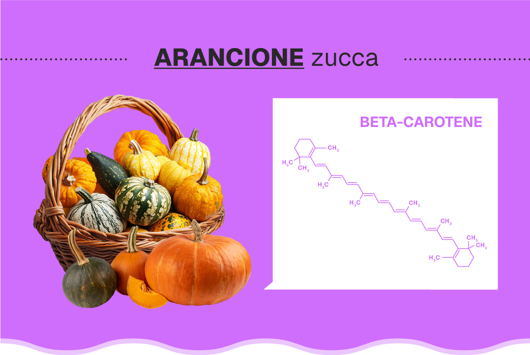 Se pensiamo alla zucca ci viene in mente l’arancione brillante della polpa. Questa colorazione è dovuta al beta-carotene, una molecola della famiglia dei carotenoidi, pigmenti naturali prodotti da alcuni vegetali, come ad esempio le carote, le patate dolci, le albicocche o il melone. La buccia invece può variare. a seconda della tipologia, dal colore verde al giallo, passando per mille sfumature di arancione.