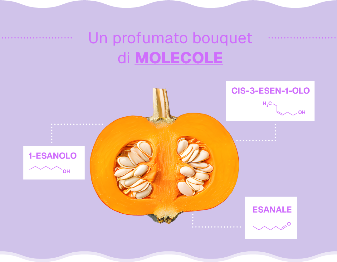 Se quando tagliamo la zucca si sprigiona un odore fresco, che ricorda il profumo dell’erba appena tagliata, è tutta colpa della chimica! Le molecole cis-3-esen-1-olo, 1-esanolo ed esanale sono responsabili di questa fragranza particolare. Quando la zucca cuoce avviene una vera e propria magia della chimica: entra in scena un altro gruppo di molecole, tra cui l’eugenolo, che dona note più dolci e speziate.