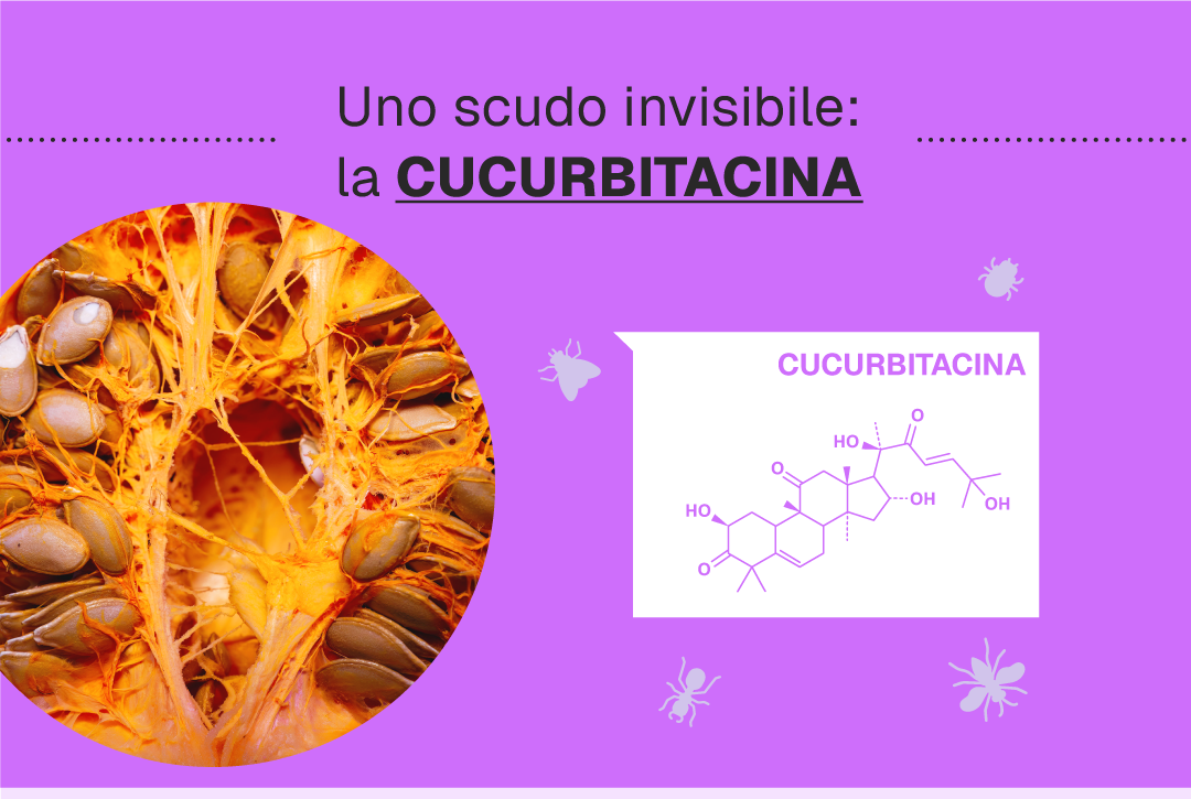 La zucca ha anche un’arma segreta che colpisce fortunatamente solo gli insetti e non i golosi della sua polpa. Si tratta della cucurbitacina, una molecola che si trova nella polpa e nei semi, così come in altri ortaggi come cetrioli e zucchine. È un composto amaro che alcuni vegetali producono per difendersi dagli insetti e dai parassiti, un ingrediente nascosto che fa da scudo naturale, senza intaccare il suo gusto inconfondibile.